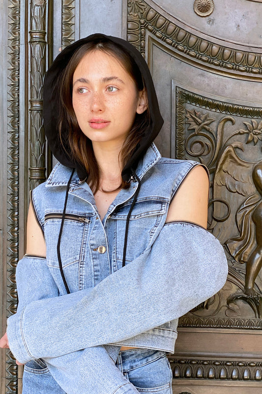Çıkarılabilir Kapüşonlu ve Kollu Yıkamalı Denim Ceket