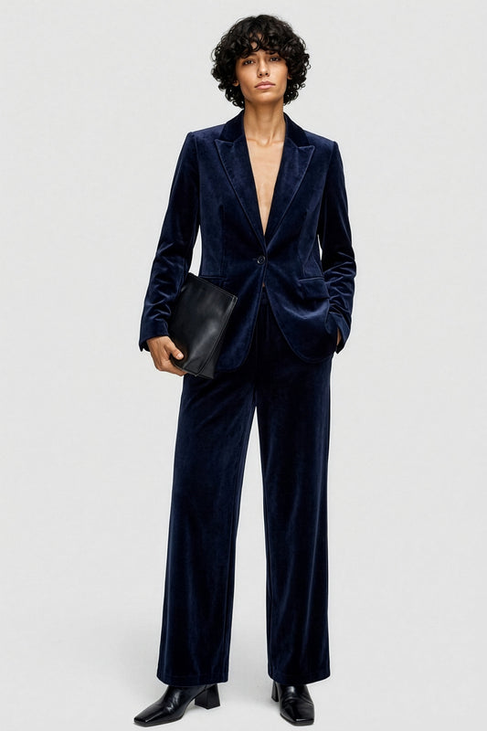 Beli Lastikli Bol Paça Lacivert Kadife Pantolon