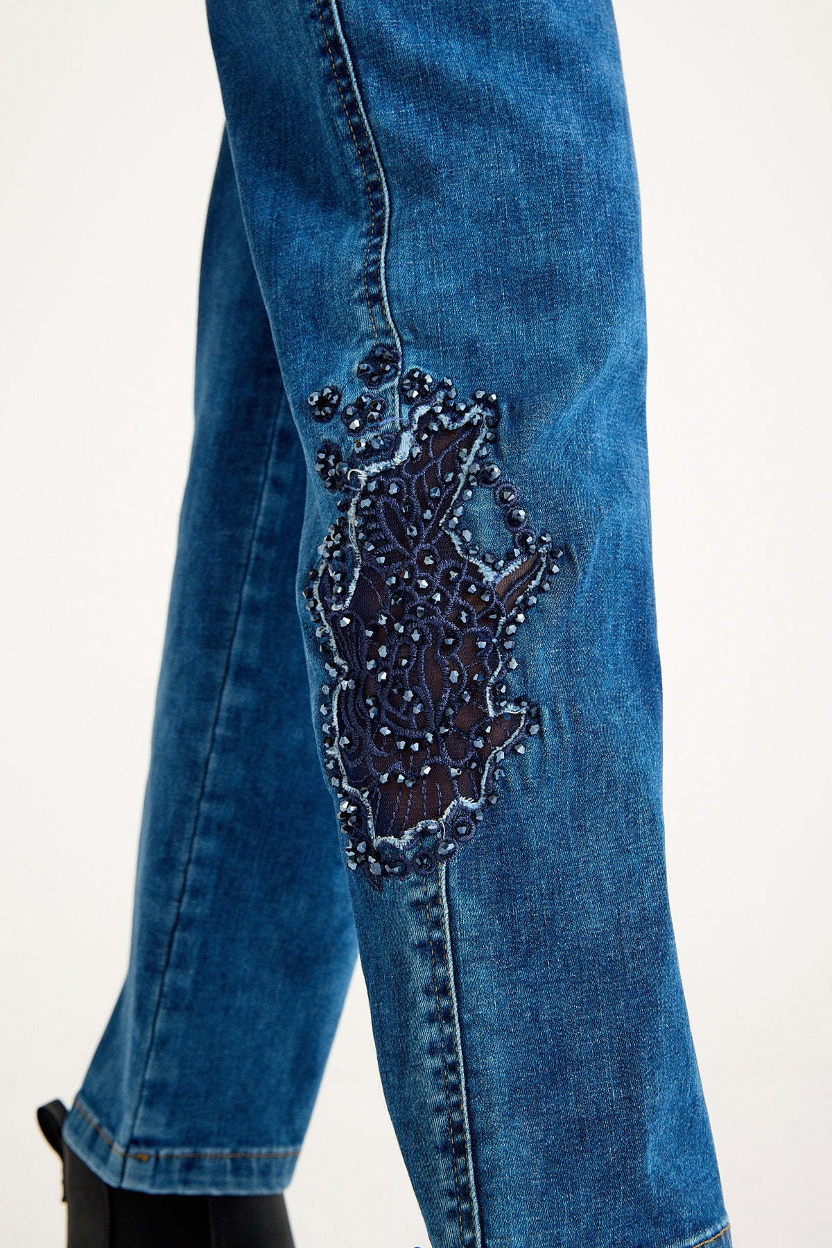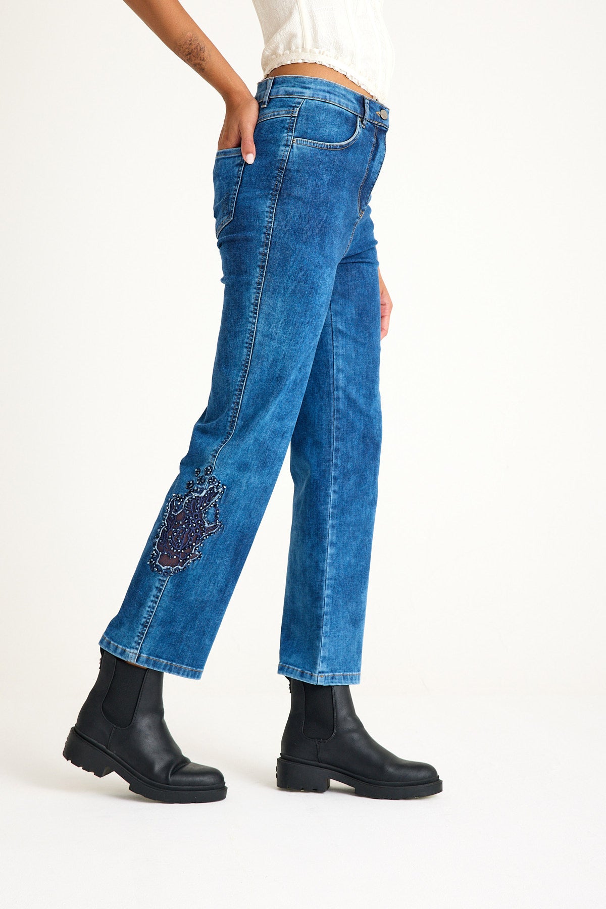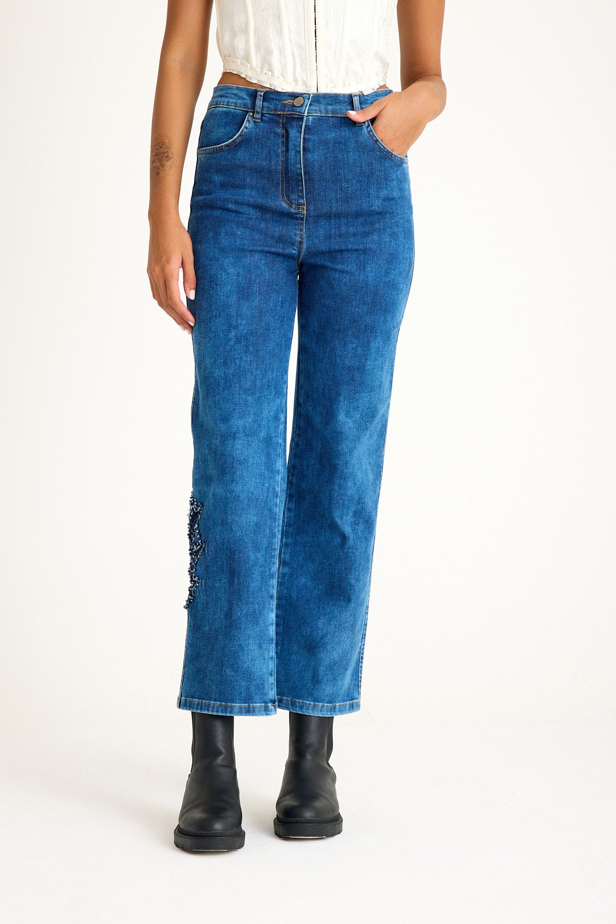 Kadın Yüksek Bel Likralı İşlemeli Mavi Jeans - Devon