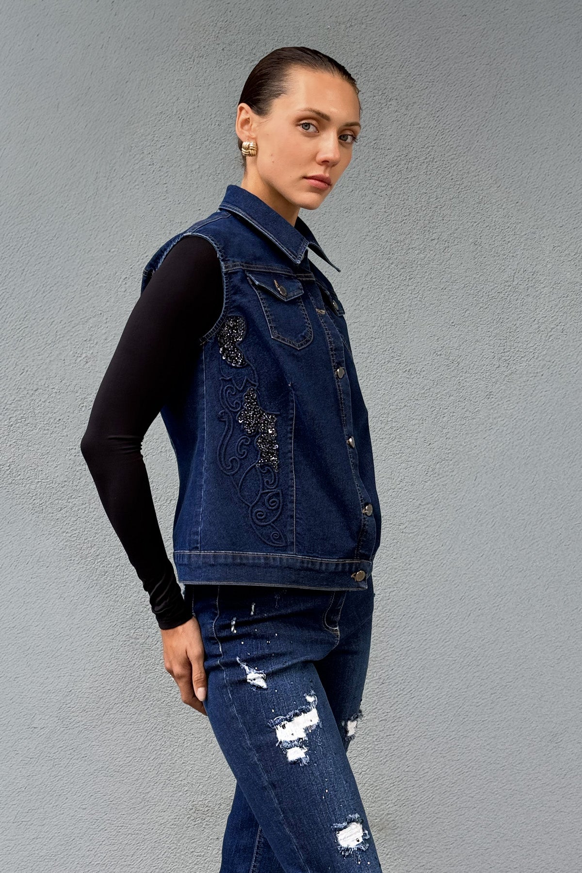 Kadın Bol Kesim Koyu Yıkamalı İşleme Detaylı Kot Yelek