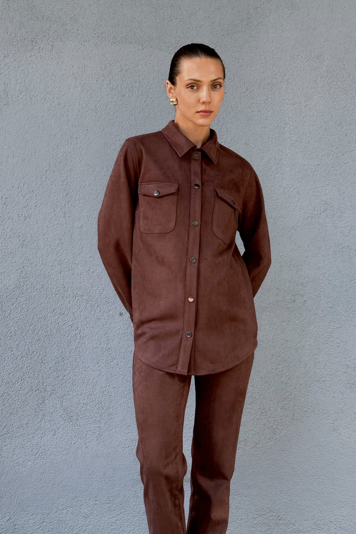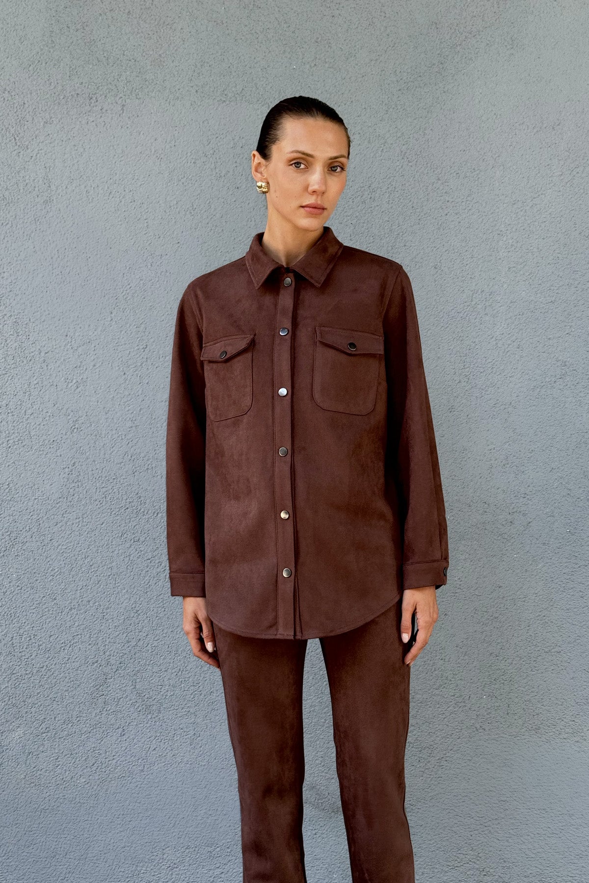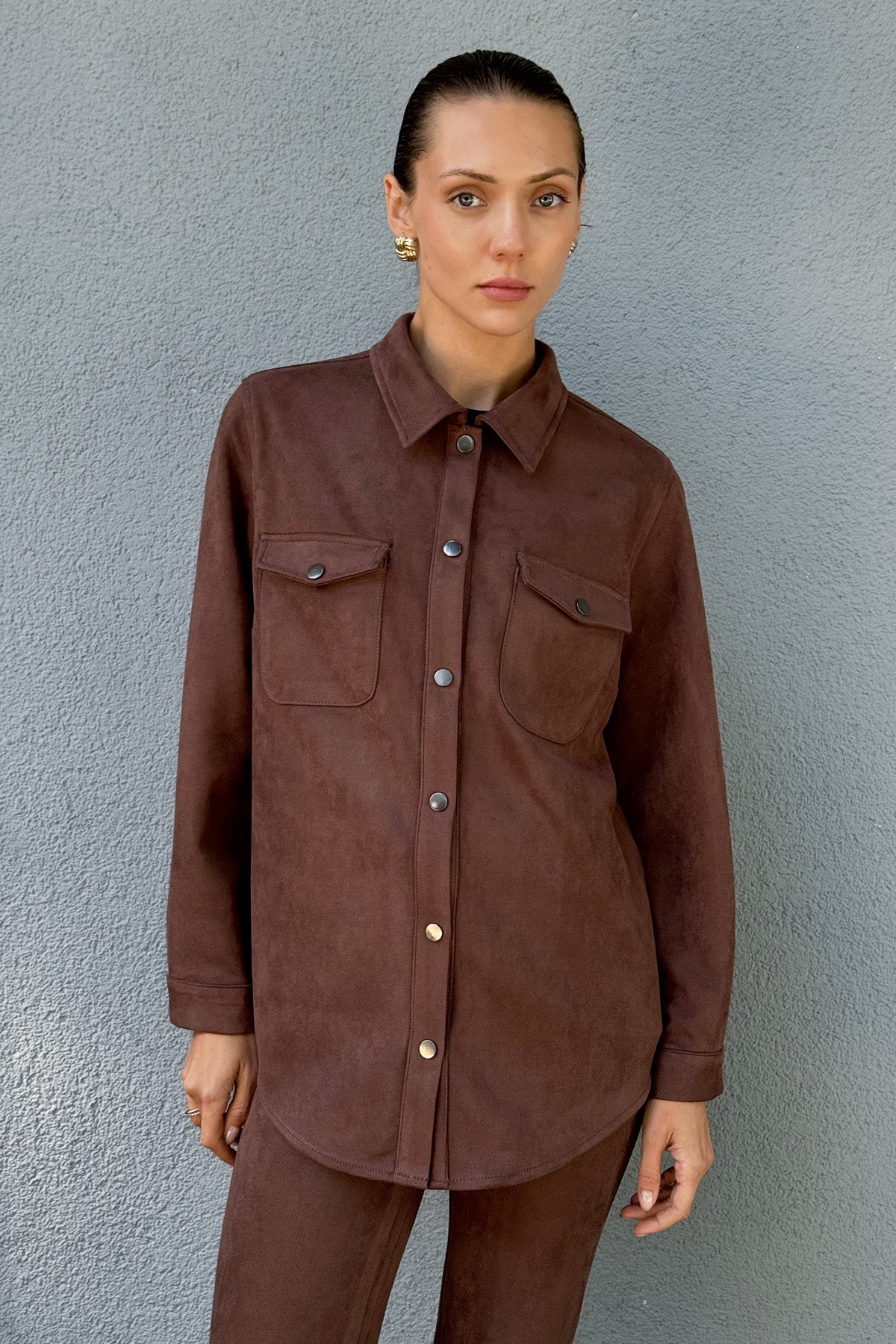 Kahve Kadın Süet Bol Kalıp Gömlek Ceket