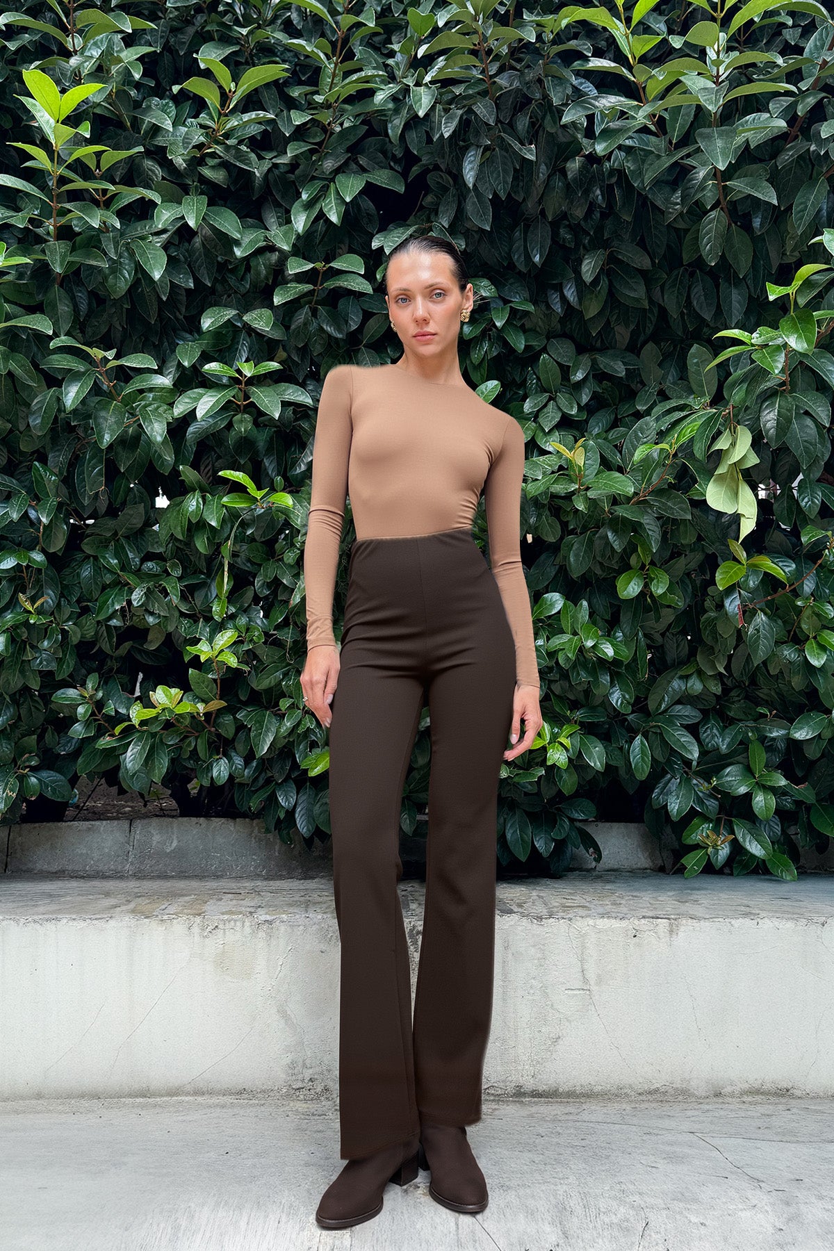 Kahve Krep Kumaş Belden Lastikli Hafif İspanyol Paça Pantolon