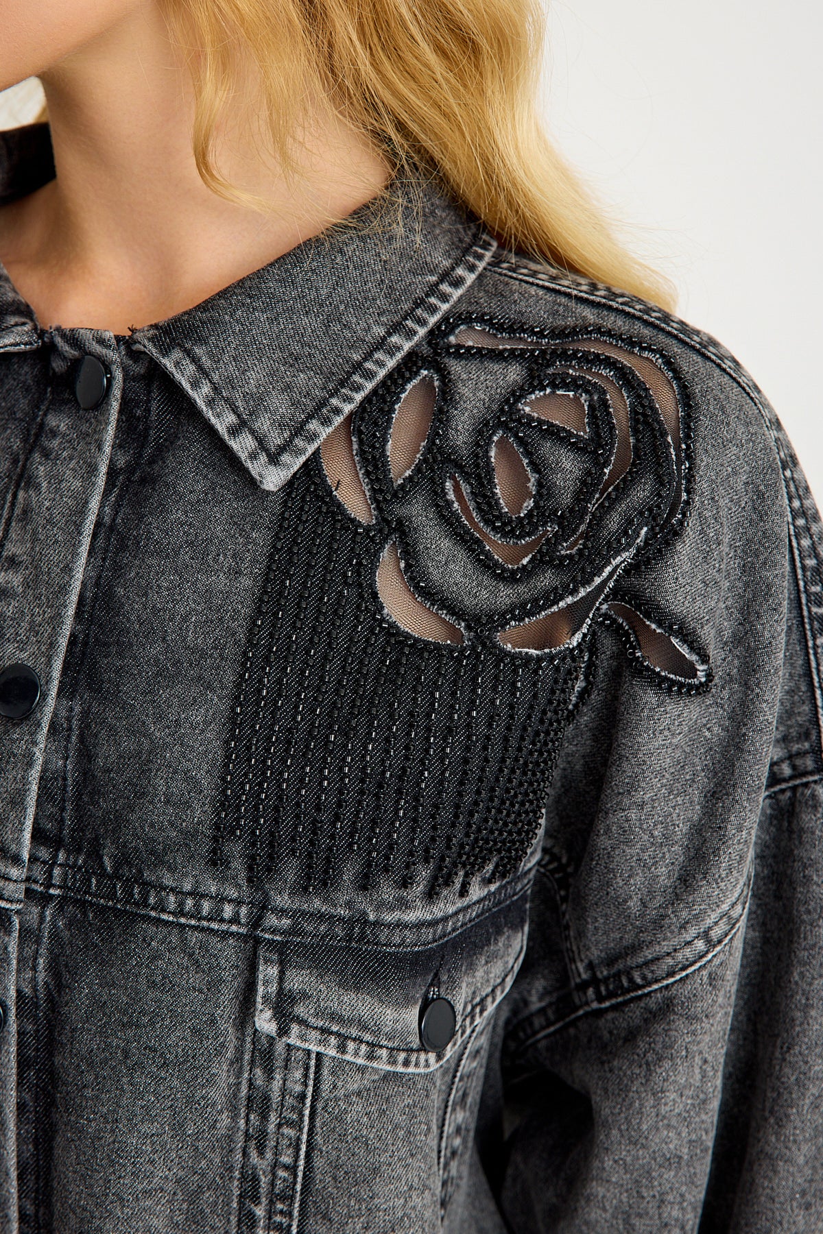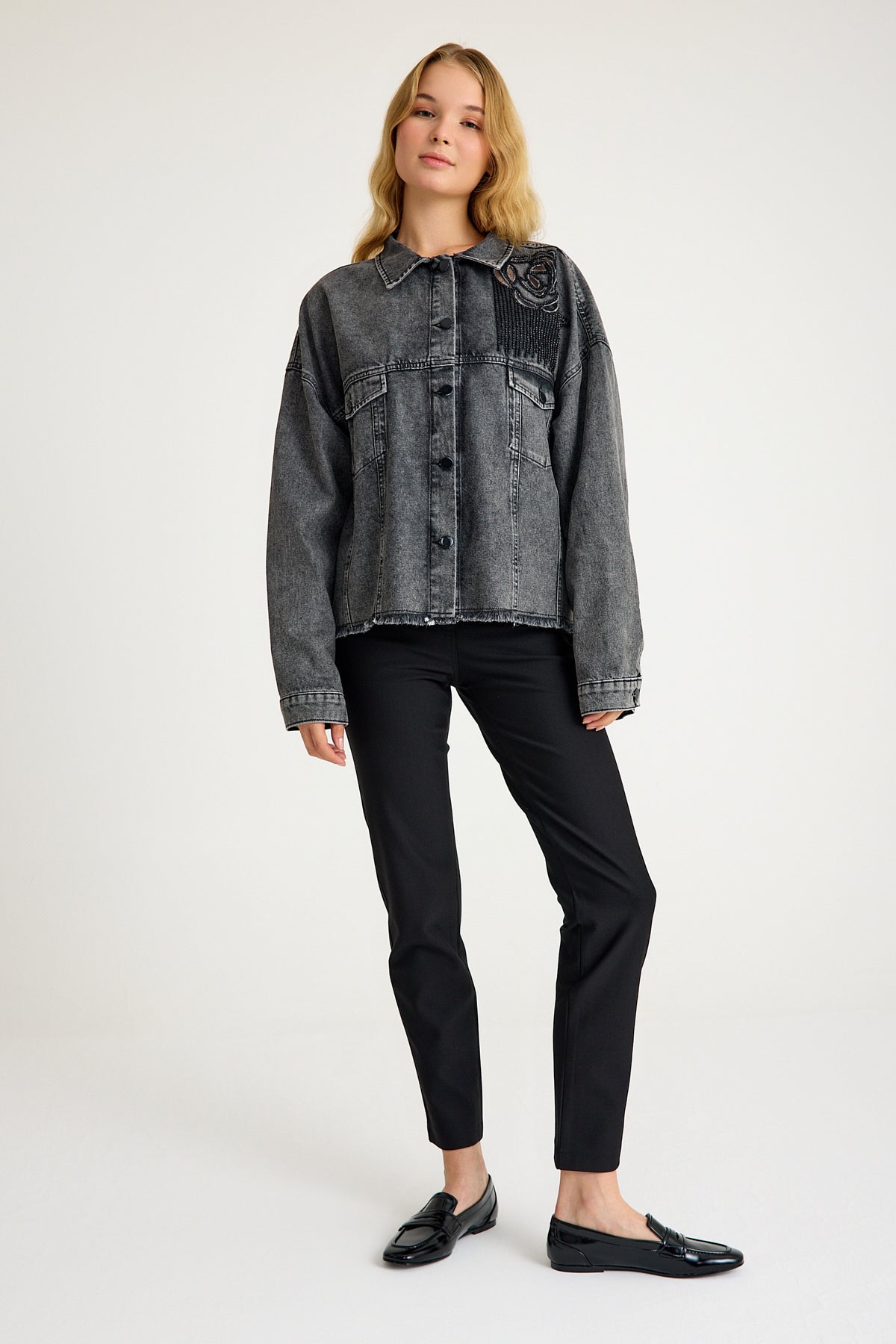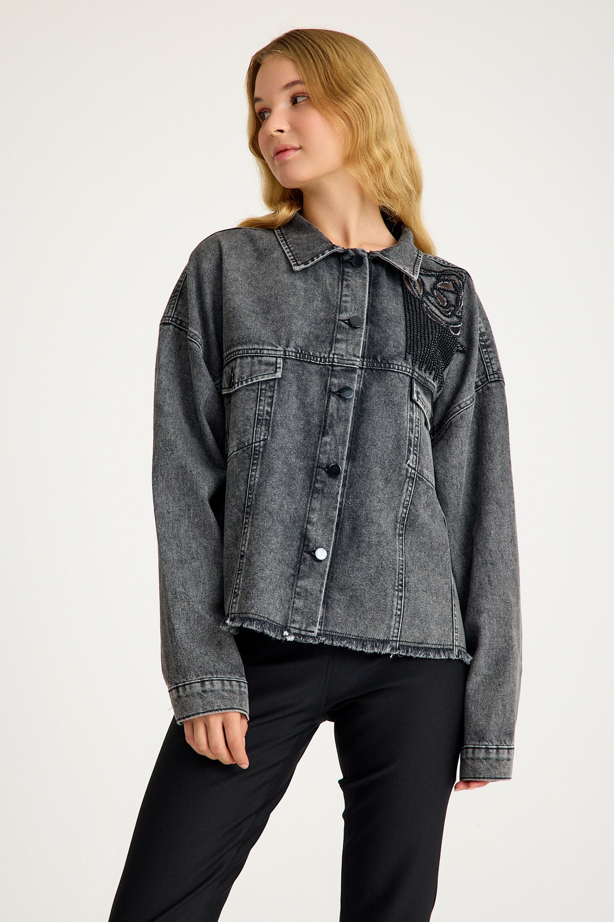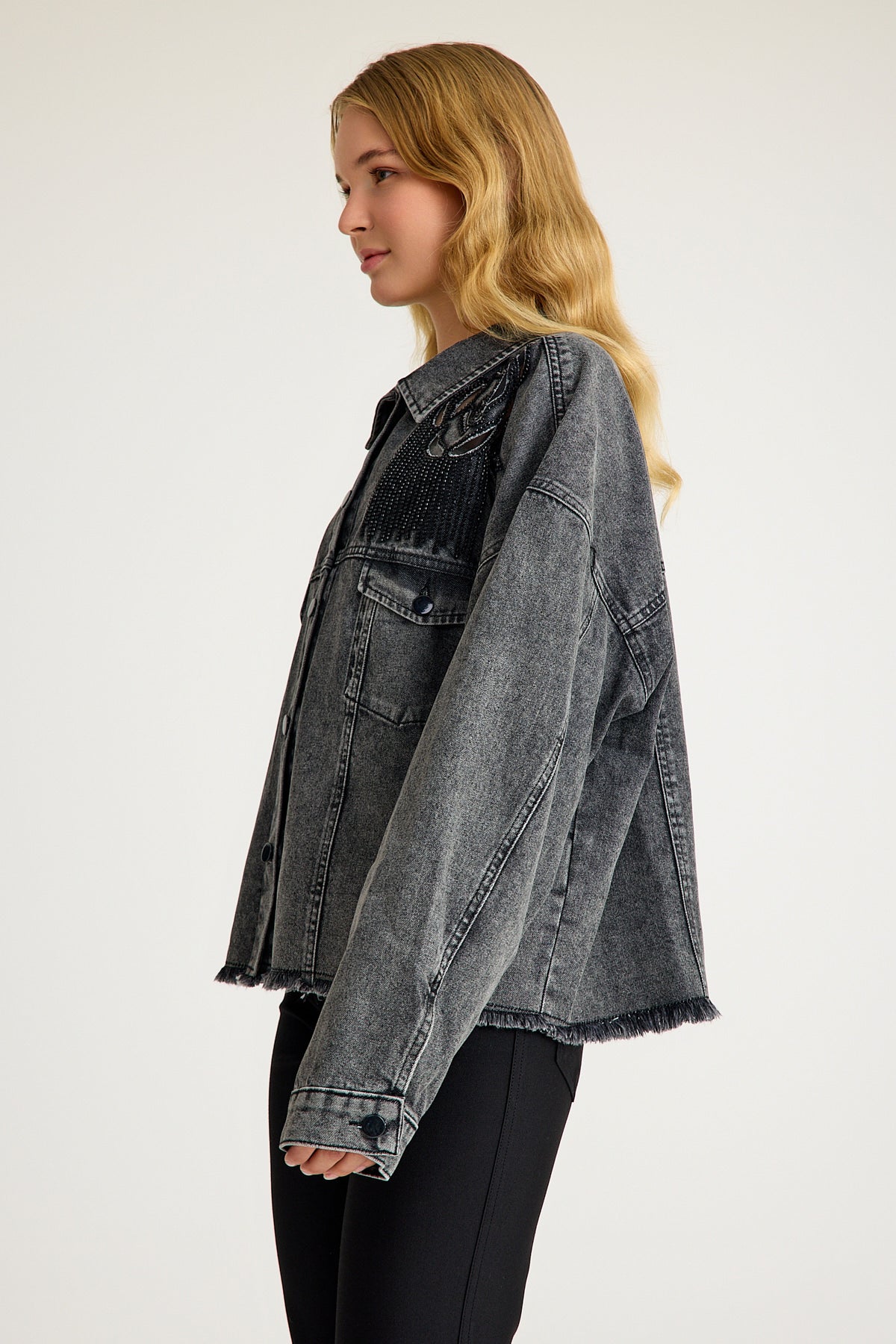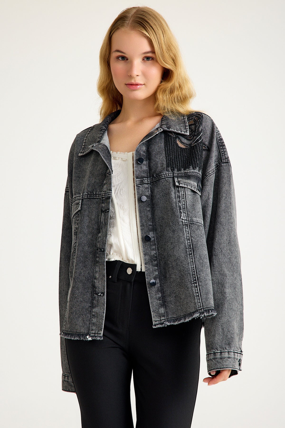 Taş Detaylı Yıpratılmış Gri Denim Ceket