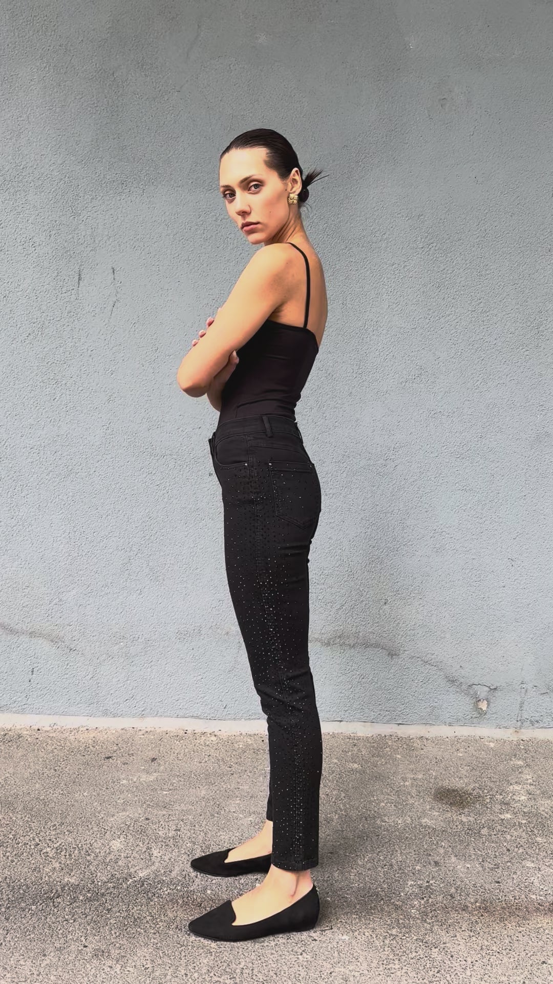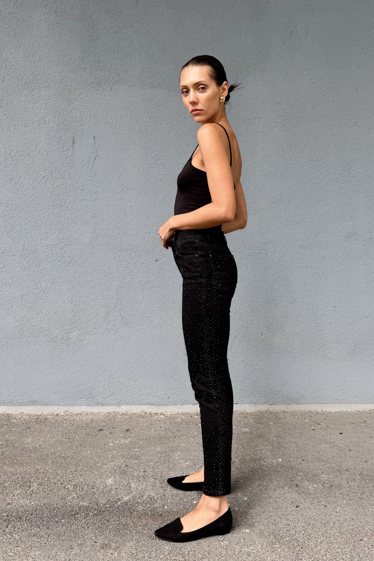 Şıklığı ve konforu bir arada sunan bu taş detaylı yüksek bel kot pantolon, göz alıcı ışıltısı ve zarif kesimiyle her stile sofistike bir dokunuş katar. Esnek likralı kumaşı sayesinde vücudu mükemmel şekilde sararken gün boyu rahat hareket imkânı sağlar. Yüksek bel formu, beli vurgulayıp bacak boyunu optik olarak uzatır. İnce taş işlemeleriyle sade şıklığı modern bir ışıltıyla buluşturur; hem gündüz hem akşam kombinlerinde kolayca kullanılabilir.