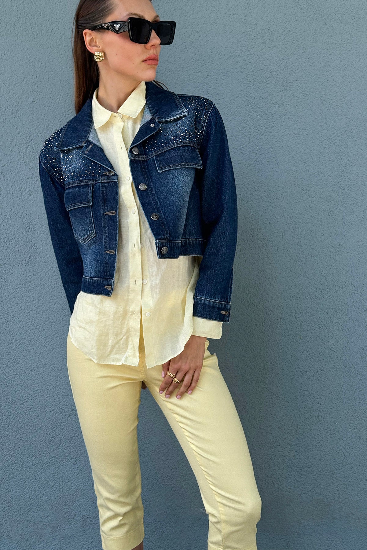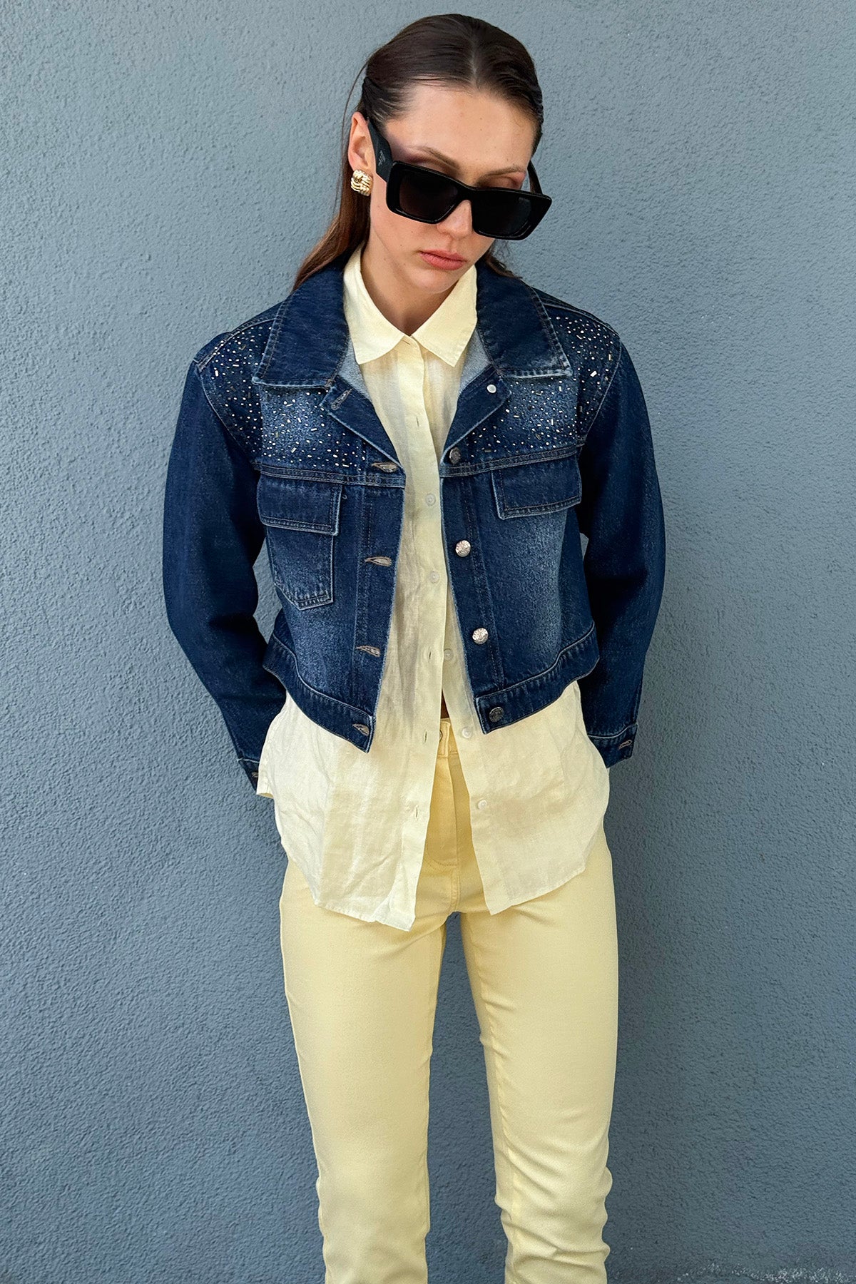 Taş İşlemeli Bol Kalıp Kısa Denim Ceket