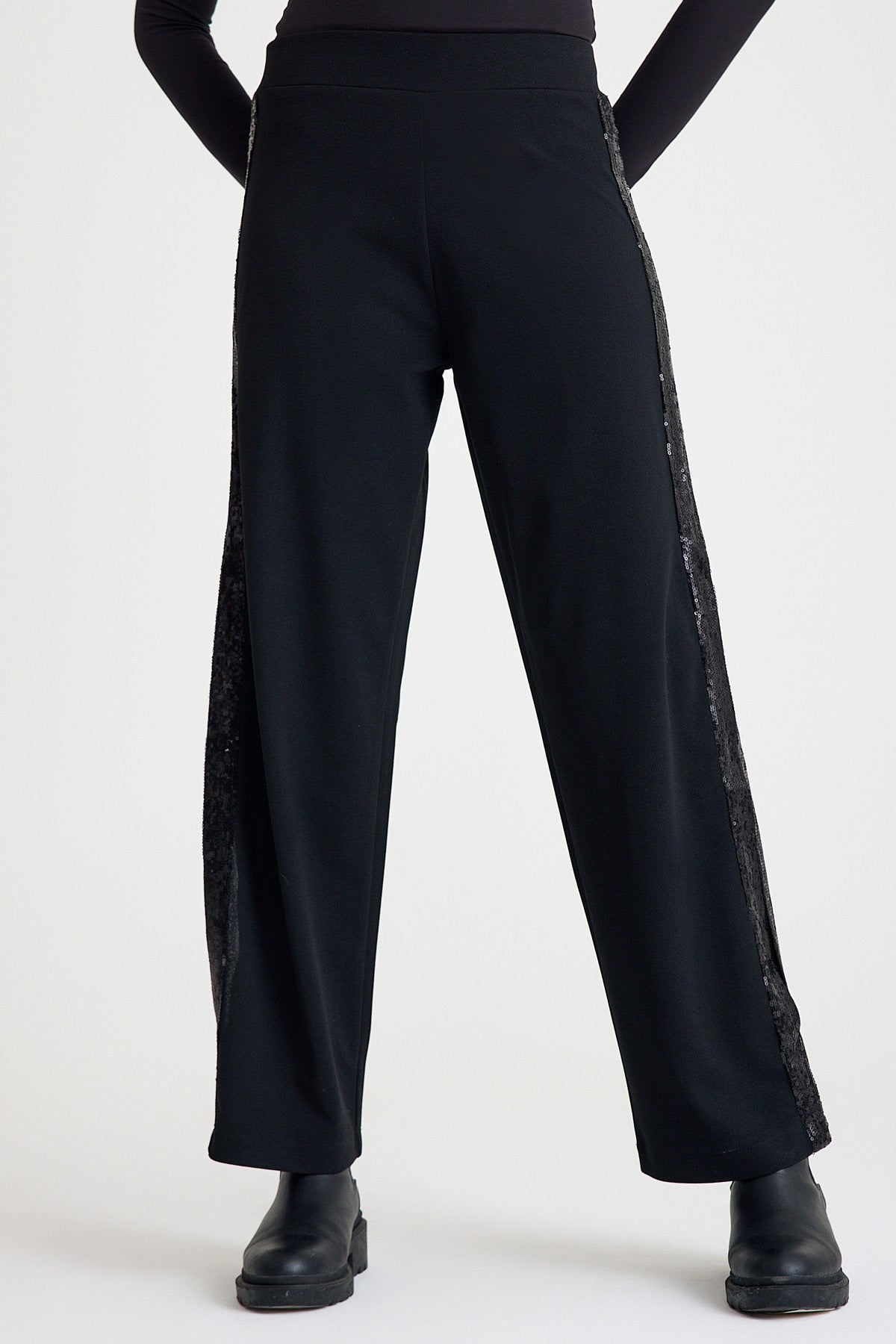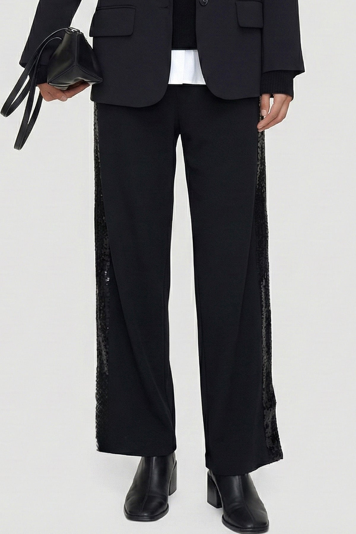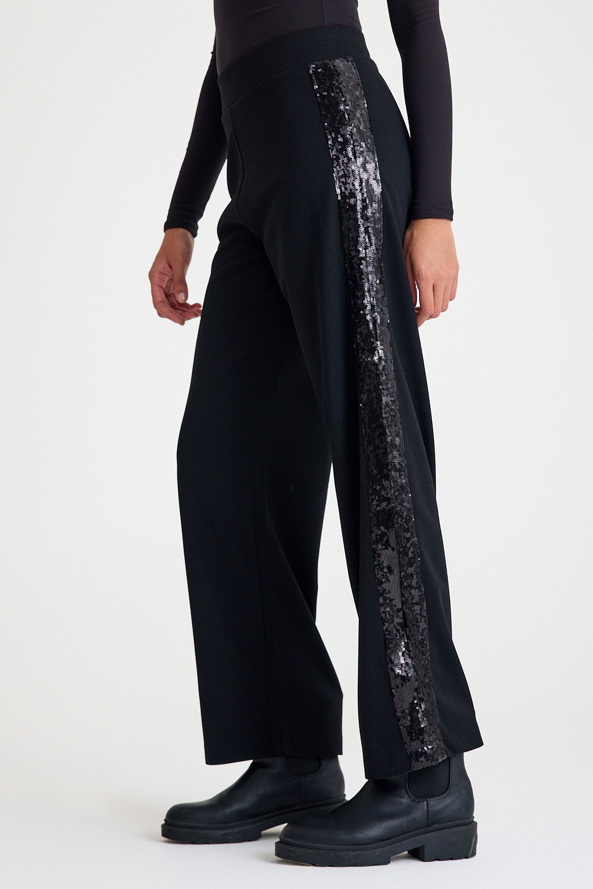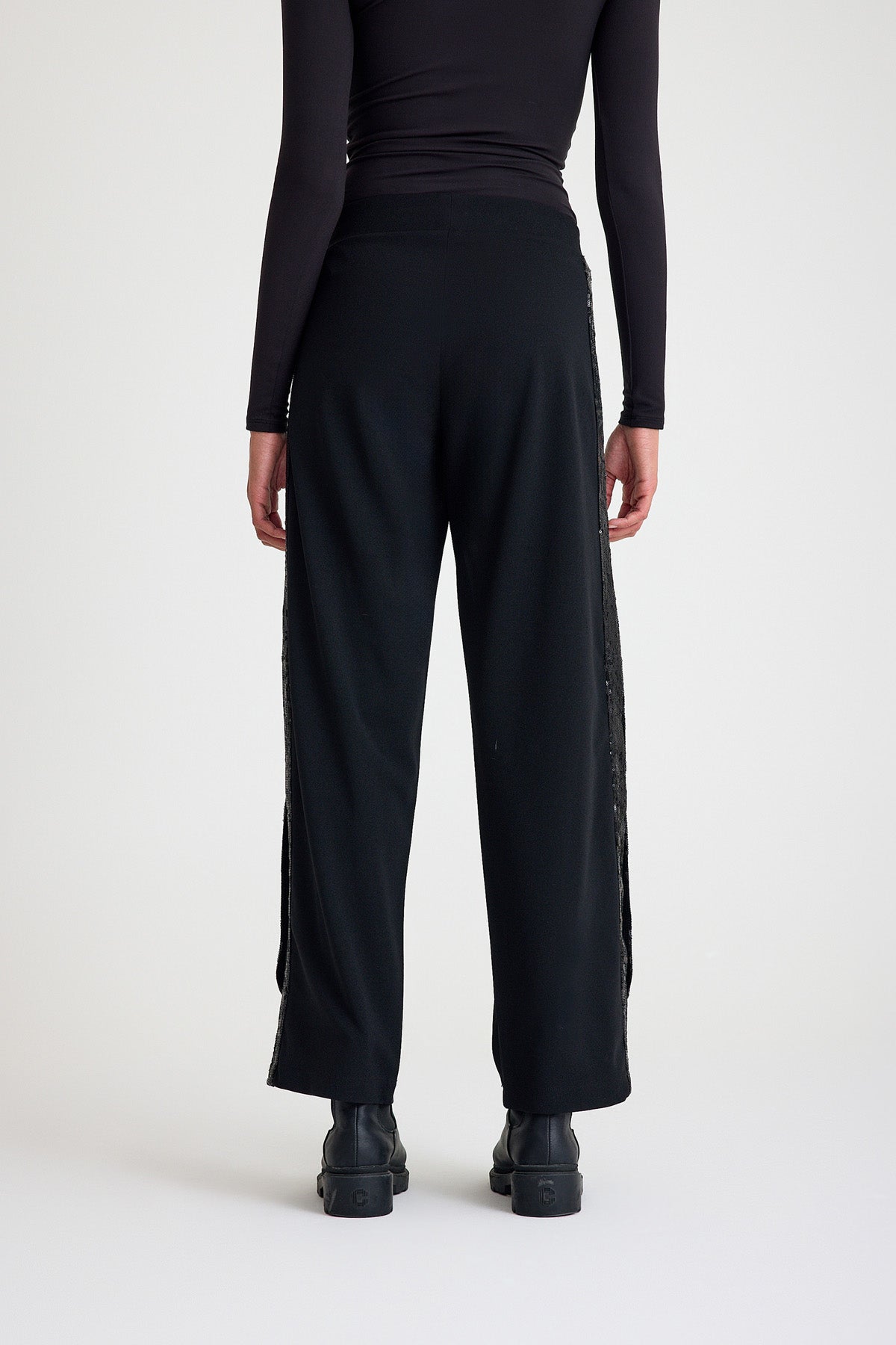 Yanları Payetli ve Yırtmaçlı Siyah Yüksek Bel Lastikli Pantolon